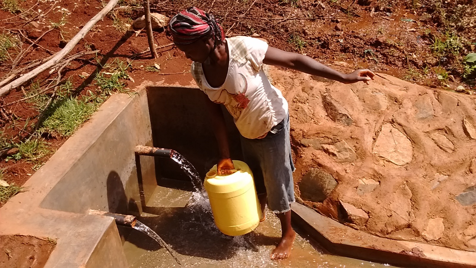 (pictured) A woman at an imporoved water Source. She walks about 1.5 Kilometer to get to this recently improved water source
