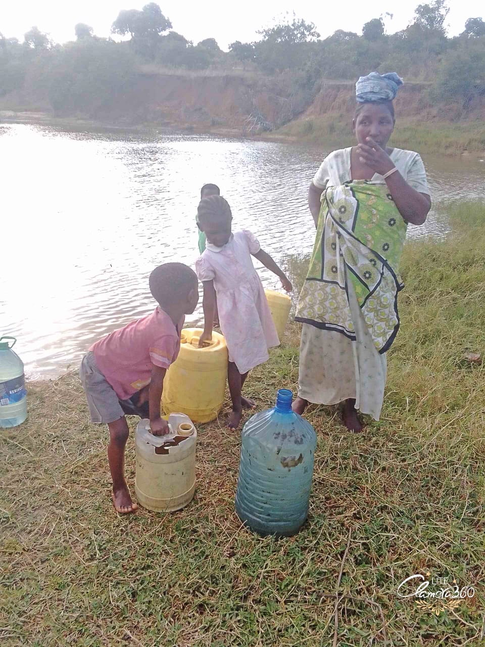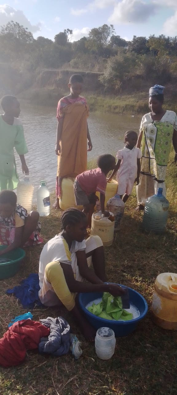 (pictured) Villagers getting water from the dam, doing laundry, and walking home with collected water.